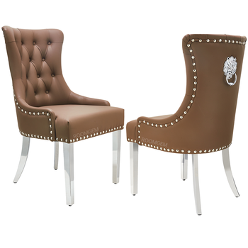 Chaise de salle à manger en cuir de luxe tête de lion meubles de maison en acier inoxydable tissu moderne base personnalisée tufté dos clou brun 12KGS